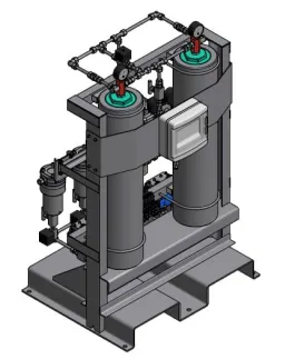 Осушитель состоит из двух колонны, наполненных высококачественным адсорбентом, контроллер с ЖК дисплеем, переключающие клапаны, манометры показывающие давление, блок управления работой осушителя, фильтр на входе и выходе из осушителя.